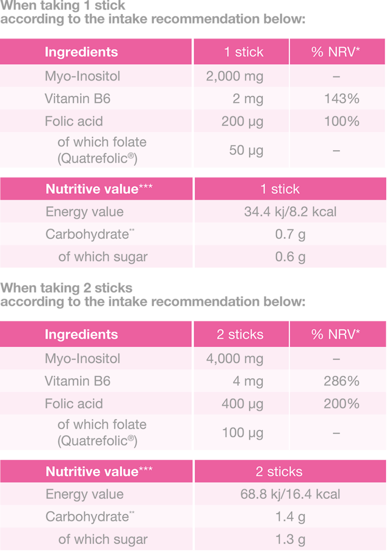 Redovan unos je ključan za podržavajući efekat. Do sada su se inozitol proizvodi u kesicama morali rastvarati u vodi, što je bilo nepraktično i lako ih je bilo zaboraviti – naročito kada ste u pokretu. PROFERTIL® inositol to menja! Praktične kesice lako stanu u džep, jednostavne su za otvaranje i mogu se uzeti odmah. Ukus „bobičastog voća“ dodatno motiviše na redovnu upotrebu.